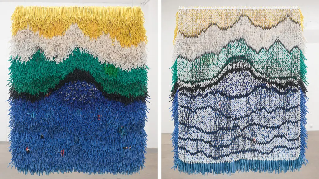 Emily Hermant, Talk Through Me, 2024, collected and folded empty ethernet cable jackets in mesh; heat shrink plastic caps; metal bar, Courtesy of the Artist and Monte Clark Gallery